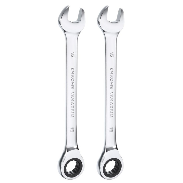 HARFINGTON 2pcs Ratcheting Wrench 15mm Metric 12PT Cr-V Polished Chromed Ratcheting Double End Combination Wrench with 72 Tooth and 5° Movement Industrial Grade Gear Spanner Tool for Repair