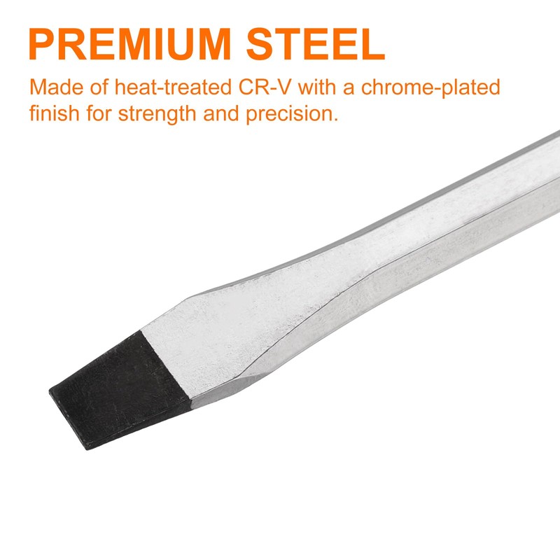 Size - This screwdriver type: Slotted; Size: SL8; Overall length: 300mm; Handle length: 100mm. Material - Made of heat-treated CR-V with a chrome-plated finish for strength and precision. Features a non-slip and durable PVC handle for long term use.
