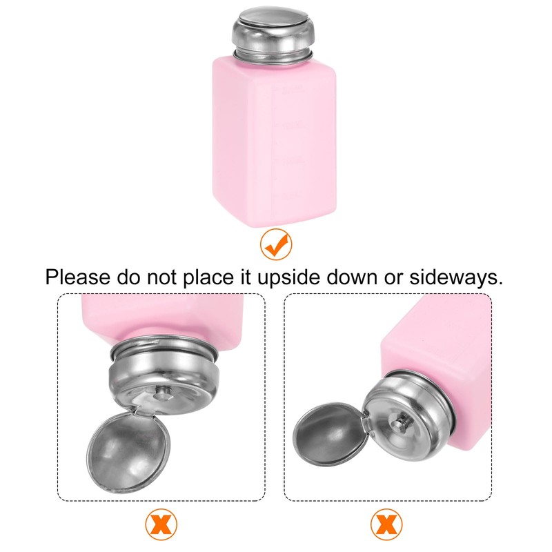 Plastic push-down dispensers are good for alcohol, acetone, skin care products water emulsion essence, cleanser, nail polish remover, makeup remover and more. Do not place it upside down, just stand upright to prevent solvent leakage, evaporation and corrosion.