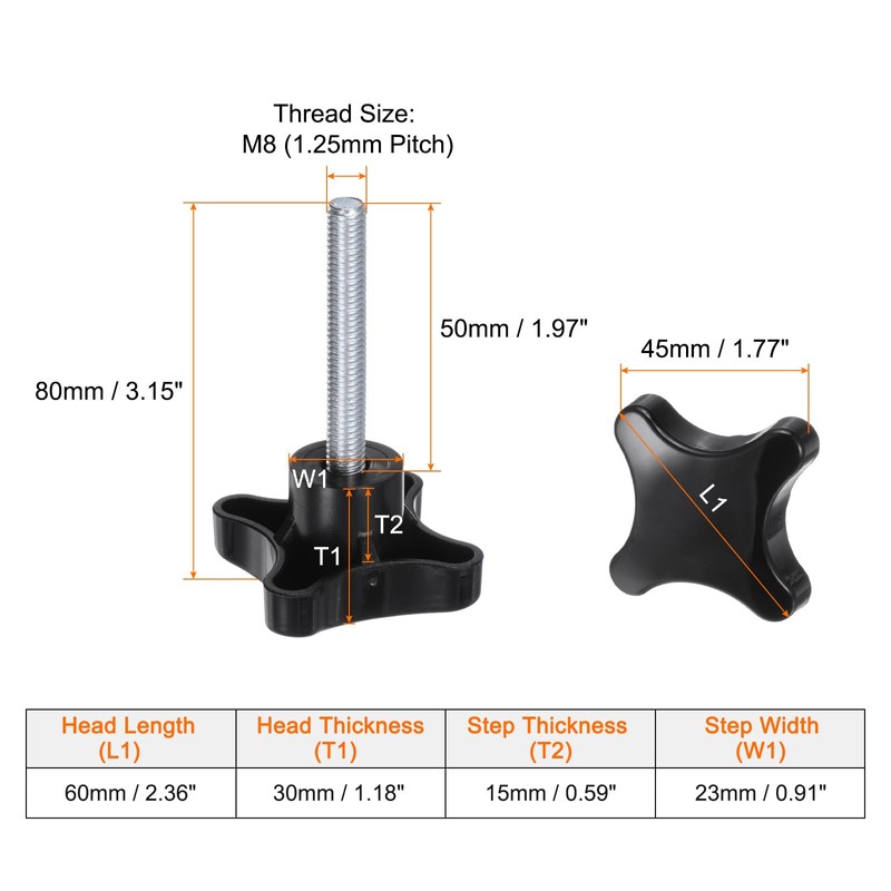 • Size - Thread size: M8 (1.25mm Pitch); threaded stud length: 50mm / 1.97"; head size: 60mm x 45mm x 30mm / 2.36" x 1.77" x 1.18"; step size: 23mm x 15mm / 0.91" x 0.59"; total length: 80mm / 3.15"; knob style: 4-star