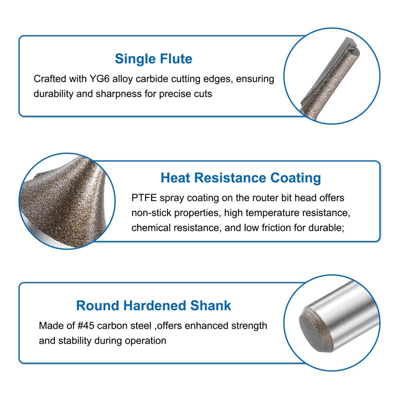 • 2-Flute Fast Cutting Tip - The double flutes straight router bit is crafted with YG6 alloy carbide cutting edges and #45 carbon steel body, ensuring durability and sharpness for precise cuts. The 2 flutes design enables efficient material removal and creates smooth finishes.