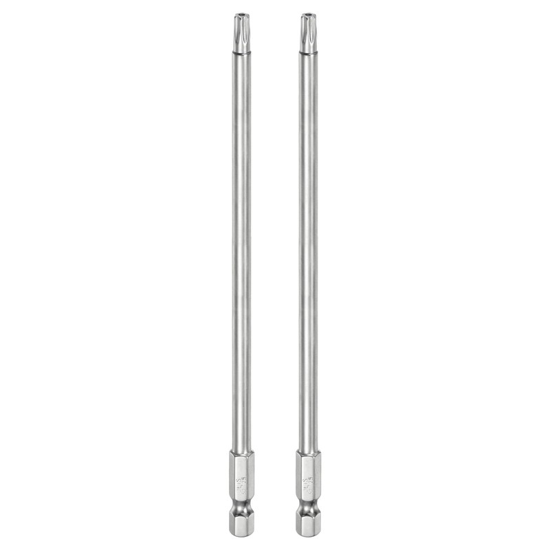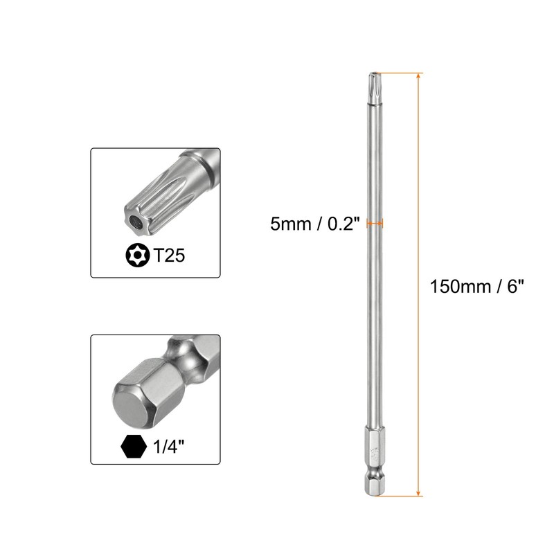 - Size - Tamper-proof torx bit size: T25, hex shank size: 1/4", total length: 150mm / 6", rod dia.: 5mm / 0.2", hardness: HRC58-60, style: torx head with hole. Each hex screwdriver bit is clearly engraved with size number for easy identification.