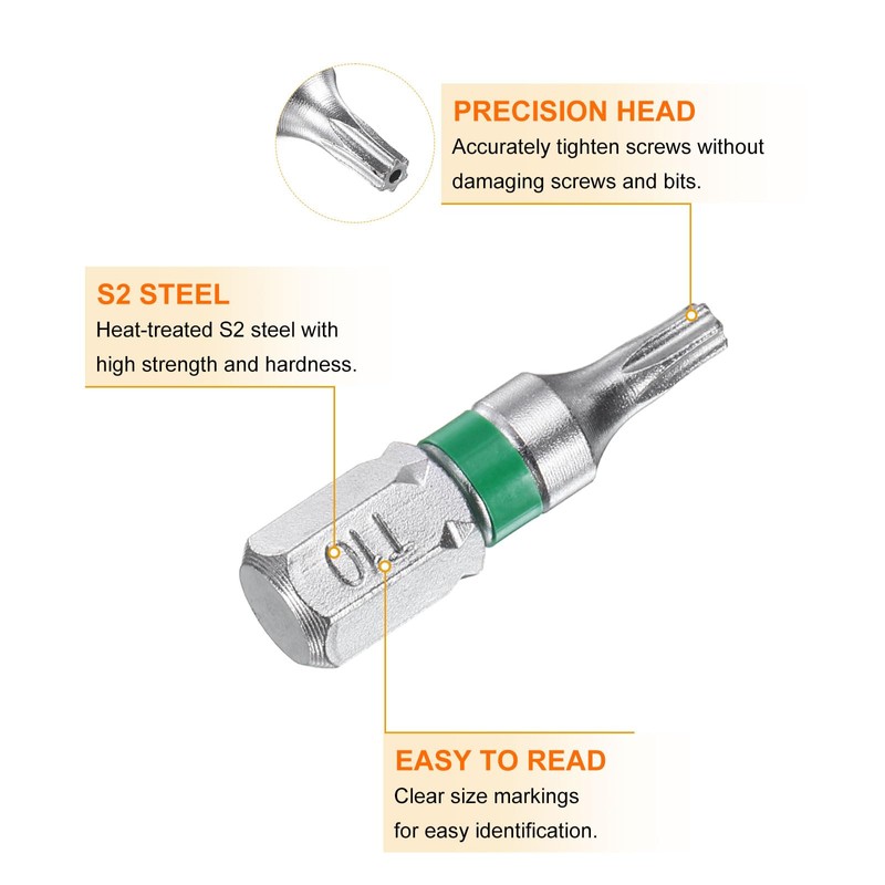 - Size - T10H; Total Length: 25mm / 1"; Torx head drill bit specifically designed for driving screws into wood, metal, and other materials effortlessly. Can accurately tighten screws without damaging screws and screwdriver bits.