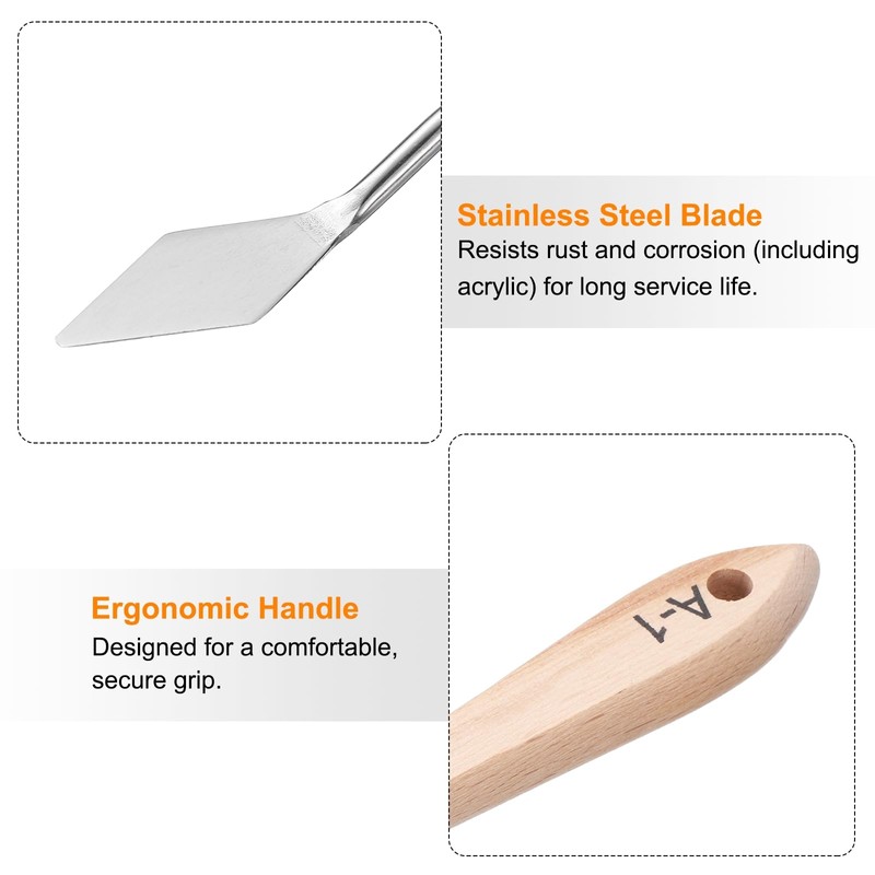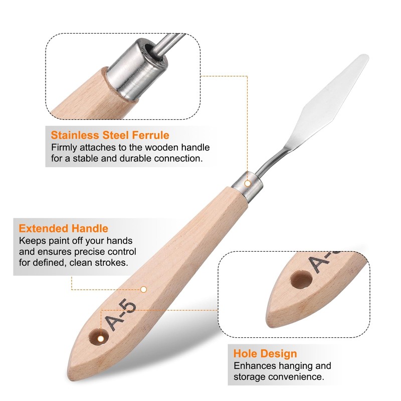 - Feature - This palette knife is crafted with a polished stainless steel blade, enhanced by a bent steel bar to contact the paint surface. The handle features a strategically placed hole, enhancing the ease of hanging and storage.