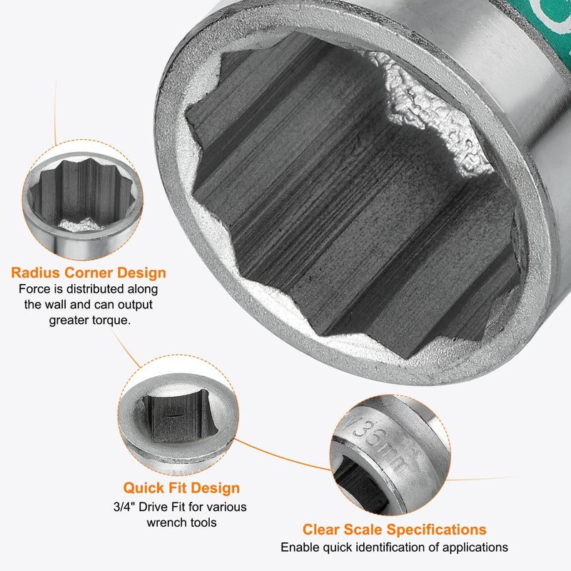 - Size - Square Drive: 3/4"; Metric 12-point Socket: 36mm; Overall Length: 59mm / 2.32", Package Includes: 1 x 12-point socket. The specifications are marked on the surface of the impact socket for easy identification and improved work efficiency.