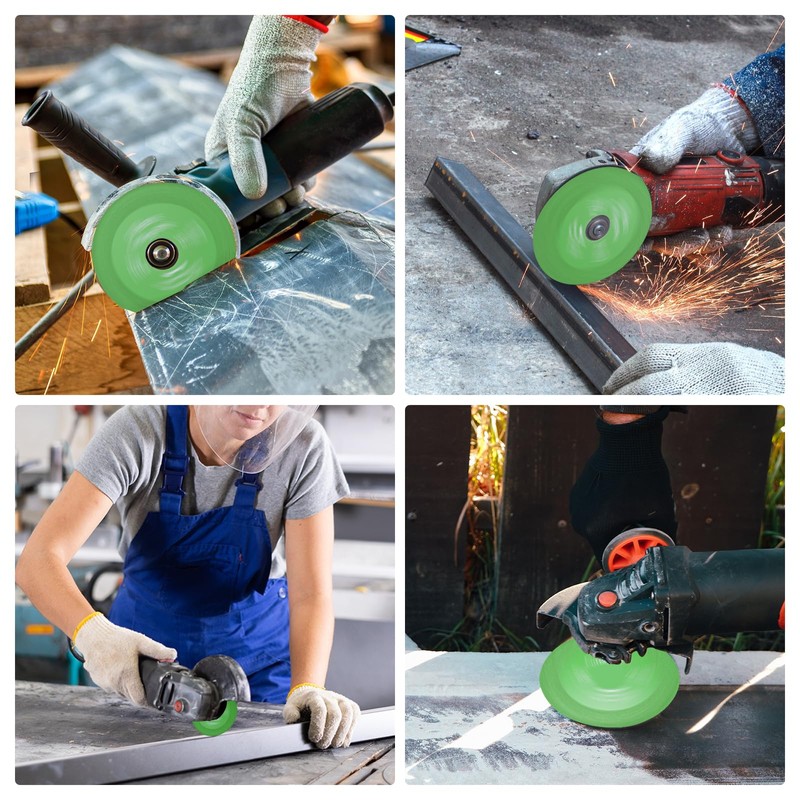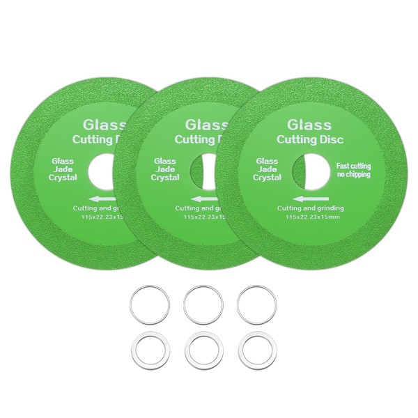 - Size - Diameter: 4.5" / 115mm; Bore Diameter: 7/8"; Thickness: 1mm; Color: Green; Material: Brazed; 3 Pack x Ultra-Thin Glass Cutting Disc (Includes 6 spacers)