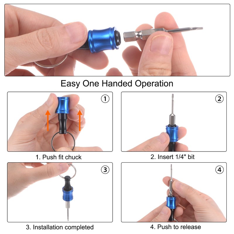 - Usage - The drill bit holder keychain is sturdy and has a ball stopper to hold the drill bit in place so the drill bit won't fall off easily. The "sliding collar release" method secures the drill bit. The locking release only works in one direction, simply pushing the knurled sleeve forward to release the existing drill bit very smoothly, preventing accidental removal.