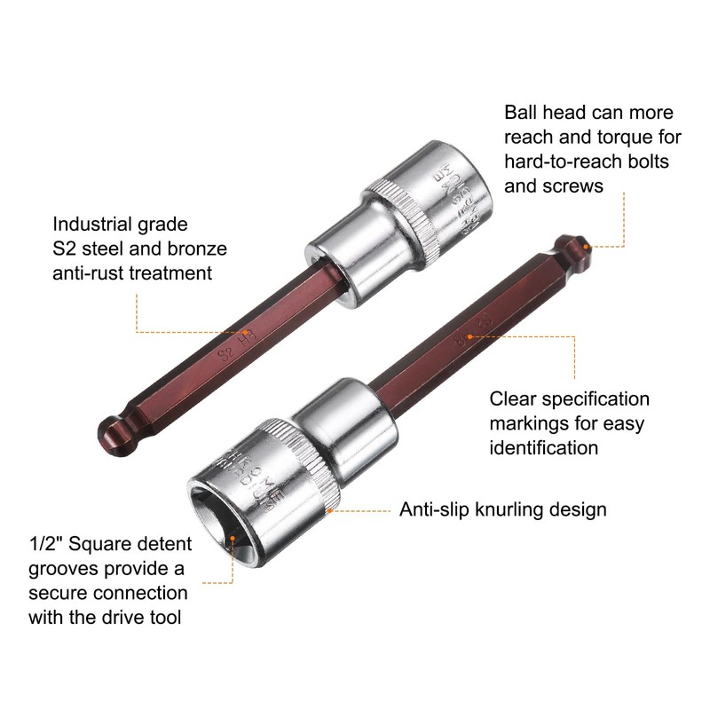 HARFINGTON 3pcs 8mm Ball End Hex Bit Socket 1/2" Square Drive Metric Extension Impact Bit Power Nut Driver Set S2 & CR-V Steel Socket Ratchet Wrench Bits