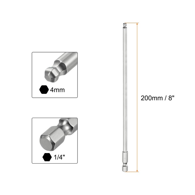 - Size - Magnetic hex ball end screwdriver bit size: 4mm (H4.0); hex shank size: 1/4"; total length: 200mm / 8"; hardness: HRC56-58. Each hex screwdriver bit is clearly engraved with the model number for easy identification.