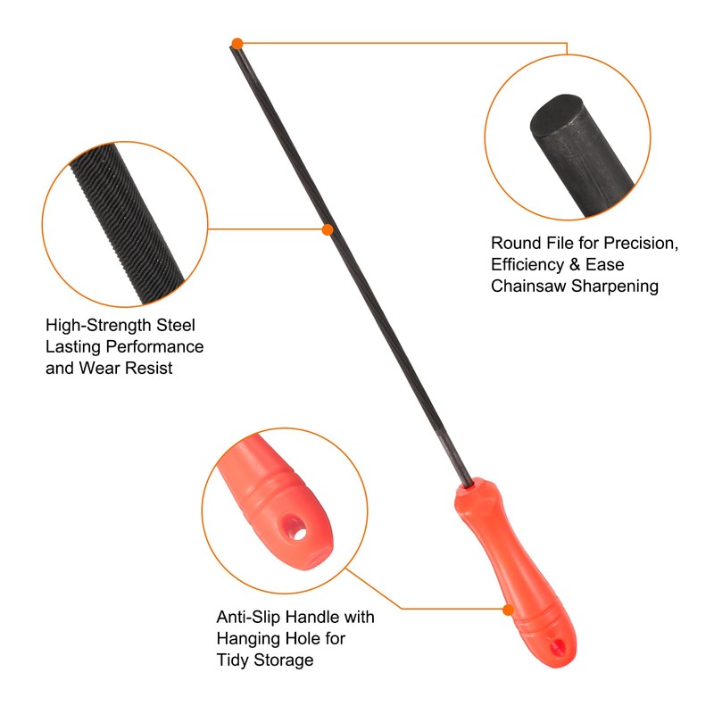 - Features - Ergonomic anti-slip plastic handle provides superior comfort, improving sharpening efficiency while maximizing control and accuracy. Its streamlined design promotes efficient filing, reducing effort and enhancing the chainsaw's cutting power. Includes a convenient hanging hole for tidy storage.