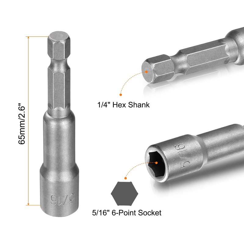 - Size - The SAE 6-point socket size is 5/16", the hex shank is 1/4", and the overall length is 2.6" (65mm).