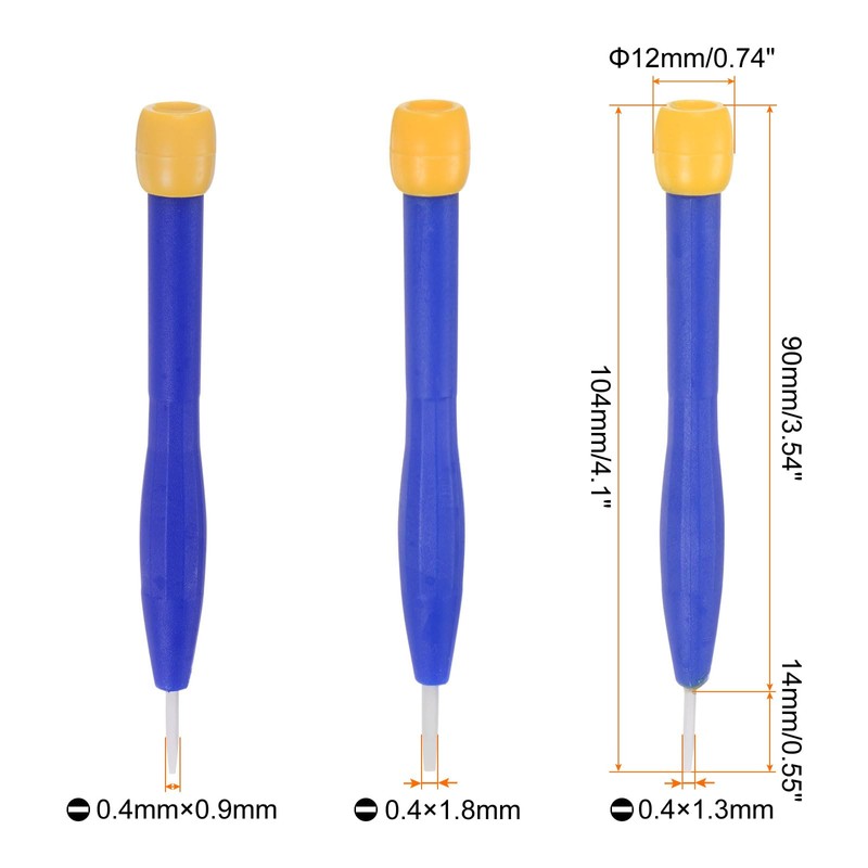 - Size - Overall Length: 104mm/4.1 inch; Handle Length: 90mm/3.54 inch; Handle Width: 12mm/0.47 inch; Slotted Screwdriver Width including: 0.9mm, 1.3mm, 1.8mm; Slotted Screwdriver Thickness including: 0.4mm; Head Length: 14mm/0.55 inch; Head Diameter: 2.5mm/0.1 inch