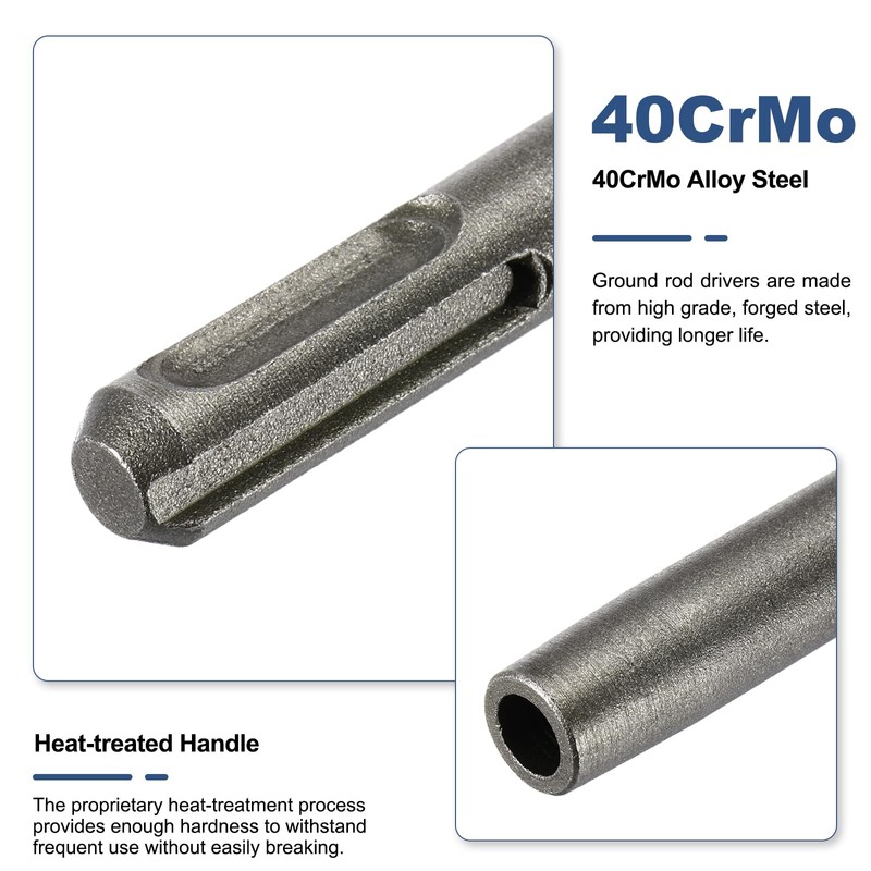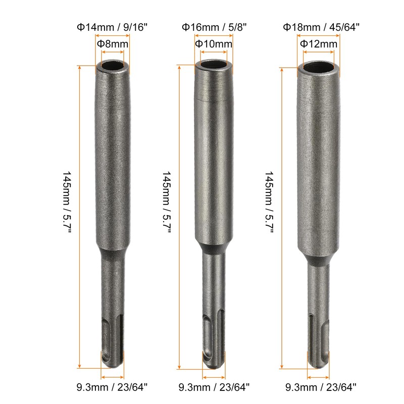 - Size - Ground Rod Driver's shank diameter is 23/64inch(9.3mm), driver outer diameter is 9/16" 5/8" 45/64inch(14,16,18mm), inner diameter is 5/16" 15/32" 9/16inch(8,10,12mm), total length is 5.7inch(145mm)