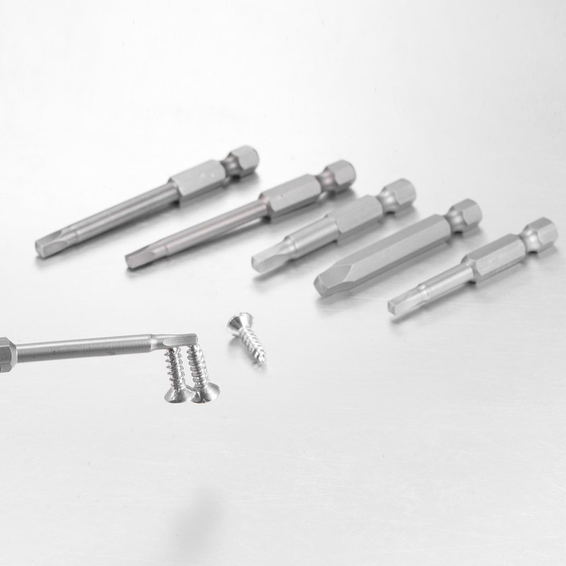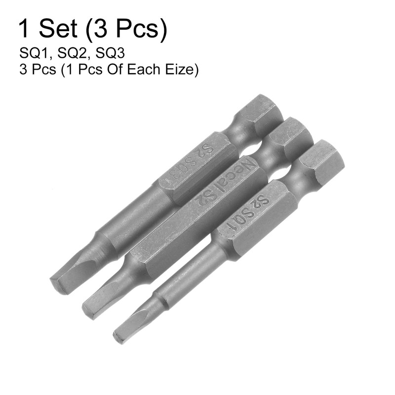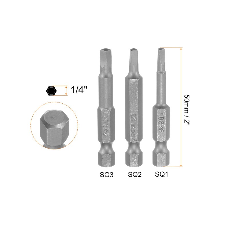 - Size - SQ1, SQ2, SQ3, Screwdriver Bits, 1/4” hex-shank, 2-inch (50mm) total length.
