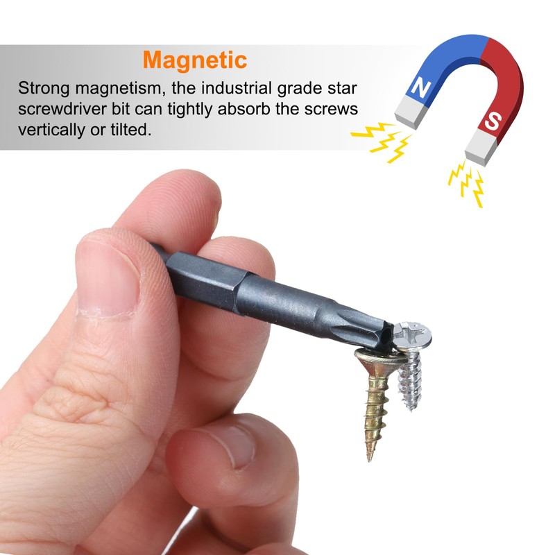 - Feature - With a strong magnetism design, the star screwdriver bit can tightly absorb the screws vertically or tilted without worrying about falling off. The head is in a hexagonal plum shape, which can be tightly connected with the screws, providing greater torque to ensure more stable installation and removal.
