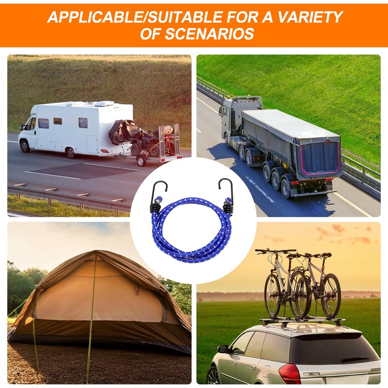 - Applications - These elastic ropes with hooks are widely used in bike racks, cars, tent poles, roof luggage racks, trailers, tents, tarpaulins, and more. A prominent application is securing heavy items on car roofs or truck compartments.