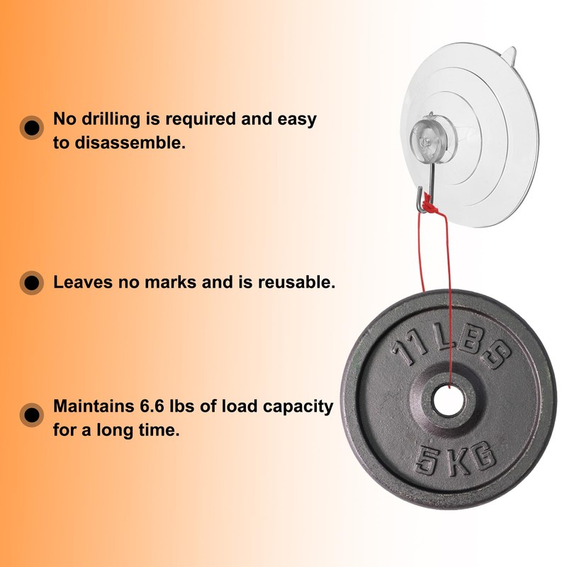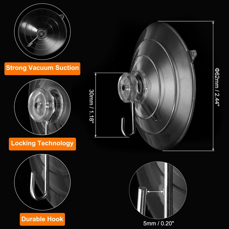 - Size - Diameter of Suction Cup: 68mm / 2.68"; Length: 68mm / 2.68"; Hook Spacing: 23mm / 0.91"; Max Load: 3kg / 6.6 Pounds; Material: PVC + PC; Color: Clear; Package Include: 4 x Suction Cup Hook.