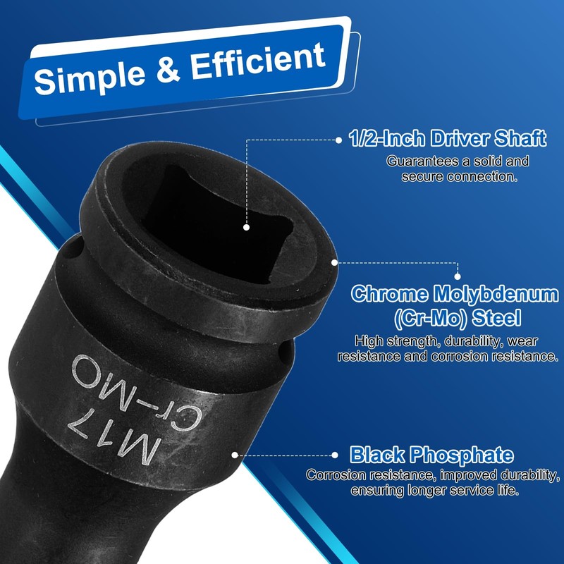 • Size - 17mm 12-point spline socket; 1/2" square drive socket; 78mm / 3" total length. Each package includes 5pcs x 6-point socket and 5pcs x cotter pin and 5pcs x O-ring