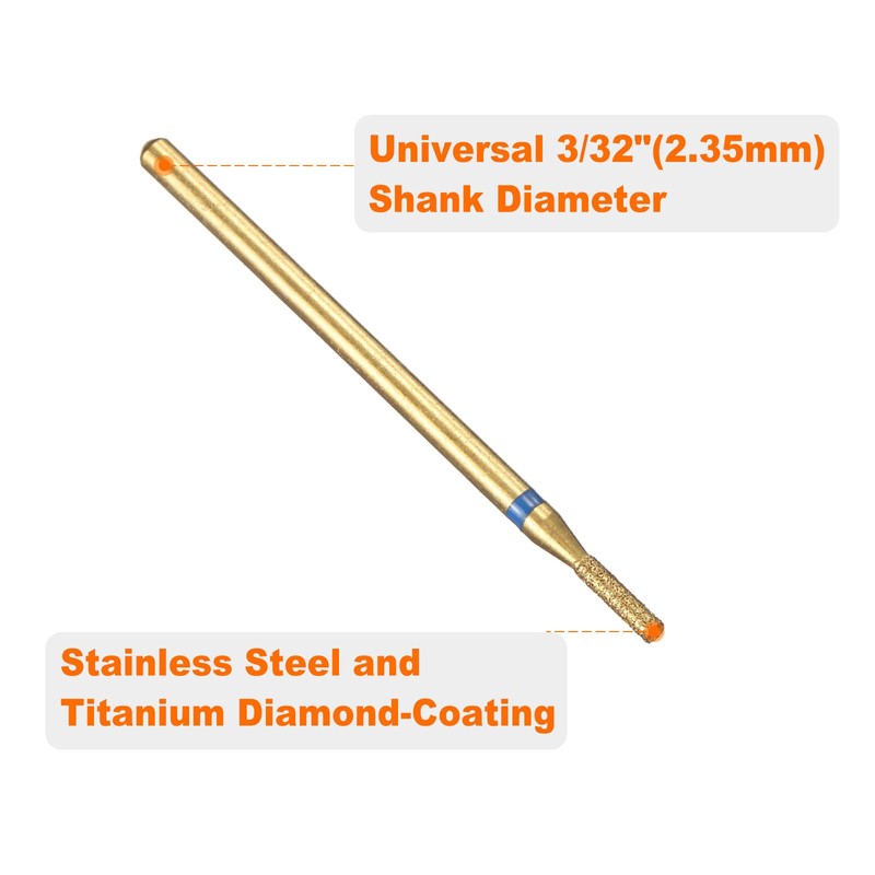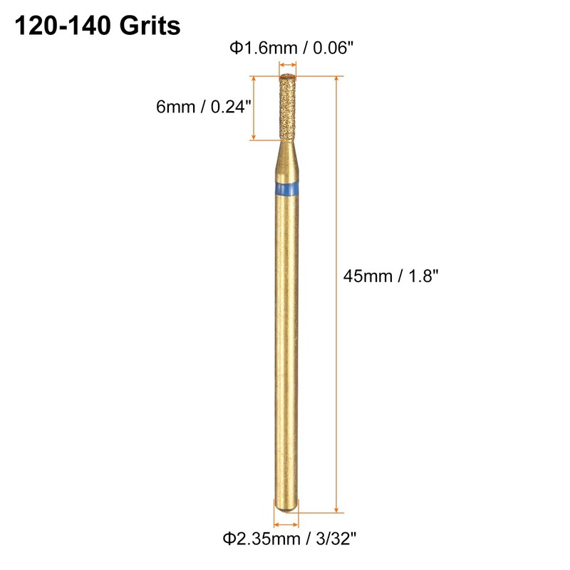 HARFINGTON 5pcs 120-140 Grits Diamond Grinding Bit 1.6mm Cylinder Head 2.35mm Shank 6mm Length Titanium Plated Stone Sanding Drill Bits Rotary Tool for Nails Grinding Polishing