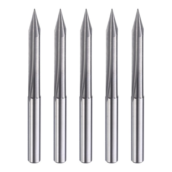 - Size - Tip Size: 0.1mm; Shank Diameter: 3.175mm / 1/8"; Degree: 30 Degree; Flute: 2 Straight Flutes; Cutting Length: 23mm / 0.91"; Overall Length: 38mm / 1.5"; Package Include: 5 x CNC V Bit.