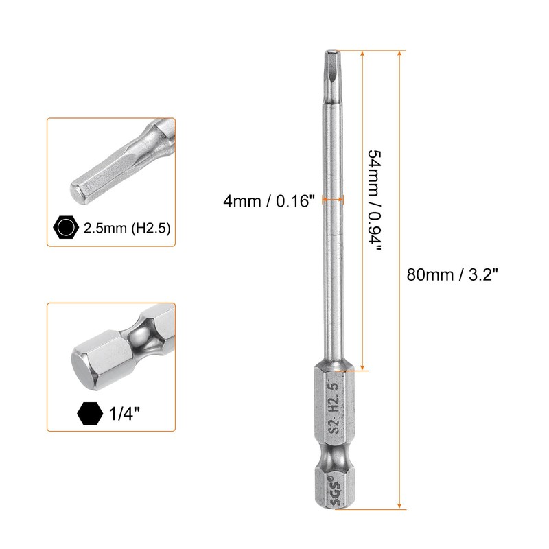 - Size - Hex wrench drill bit size: 2.5mm (H2.5), hex shank size: 1/4", total length: 80mm / 3.2", rod dia.: 4mm / 0.16", effective rod length: 55mm / 0.94", hardness: HRC58-60. Each hex screwdriver bit is clearly engraved with size number for easy identification.