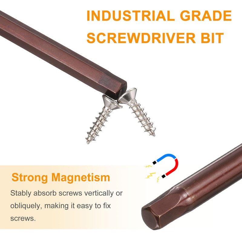 - Feature - Industrial screwdriver bit adopts a strong magnetism design and can absorb screws vertically or tilted. The head is a hexagonal flat head shape, which can make close contact with the screw, making disassembly and installation more stable and less likely to slip.