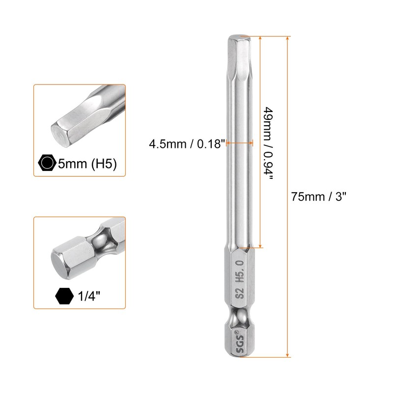 • Size - Hex wrench drill bit size: 5mm (H5), hex shank size: 1/4", total length: 75mm / 3", rod dia.: 6mm / 0.24", effective rod length: 49mm / 0.94", hardness: HRC58-60. Each hex screwdriver bit is clearly engraved with size number for easy identification.