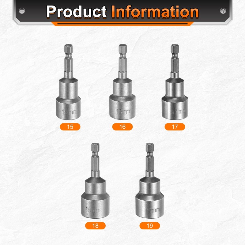 HARFINGTON 5pcs Hex Nut Driver Drill Bit 15/16/17/18/19mm 6-Point Drill Socket 1/4" Hex Shank 65mm Length Magnetic Nut Setter Quick-Change Nut Impact Driver Bit Set with Bit Holder