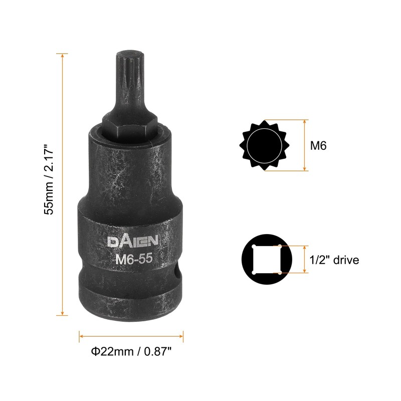 - Size - M6, 1/2" drive, Total Size: 55x22mm / 2.17"x0.87", Rod Length: 16.5mm / 0.65"; The chamfer design can be easily, smoothly and accurately inserted to protect the drill bit and fasteners from damage