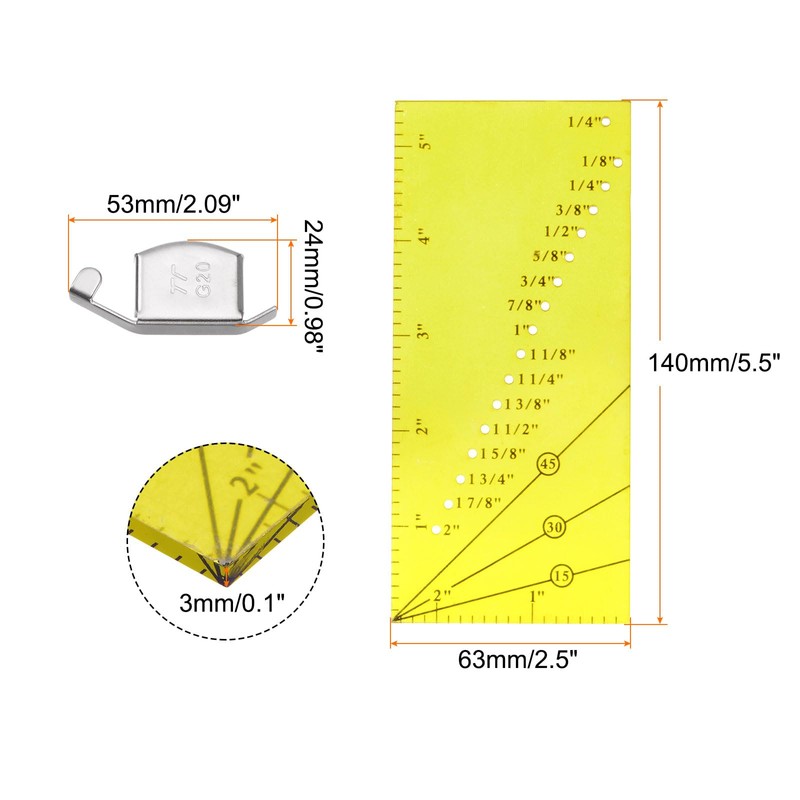 - Size - Sewing Ruler: 140x63x3mm/5.5"x2.5"x0.1"(L*W*H), G20S Seam Guide: 45x18x6.5mm/1.8"x0.7"x0.3"(L*W*H). Seam guide ruler with 16 incremental holes to help you measure 1/8" to 2" seam edges, includes 1/4" pivot points and a 45-degree trim line for binding and trimming shapes.