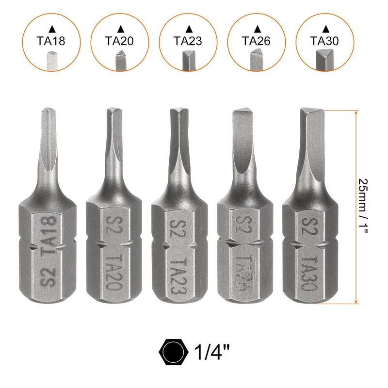 - Size - Triangle head size: TA18, TA20, TA23, TA26, TA30; hex shank size: 1/4"; overall length: 25mm / 1"; hardness: HRC-61 (The recognized stable hardness is around HRC60.). Special torque buffer design, when the vibration generated during operation is absorbed by this part, the torque transmission is increased, achieving the effect of protecting the screwdriver head and extending the service life.