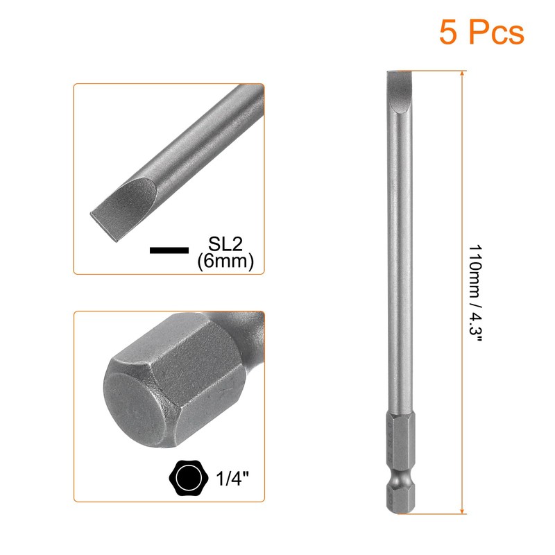 - Size - Magnetic slotted screwdriver bit size: SL2 (6mm), Rod diameter: 6mm / 0.24", Total length: 110mm / 4.3", Hex Shank: 1/4". Each screwdriver head is clearly engraved with the model for easy identification.