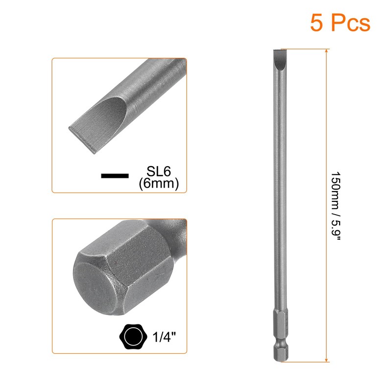 - Size - Magnetic slotted screwdriver bit size: SL2 (6mm), Rod diameter: 6mm / 0.24", Total length: 150mm / 5.9", Hex Shank: 1/4". Each screwdriver head is clearly engraved with the model for easy identification.