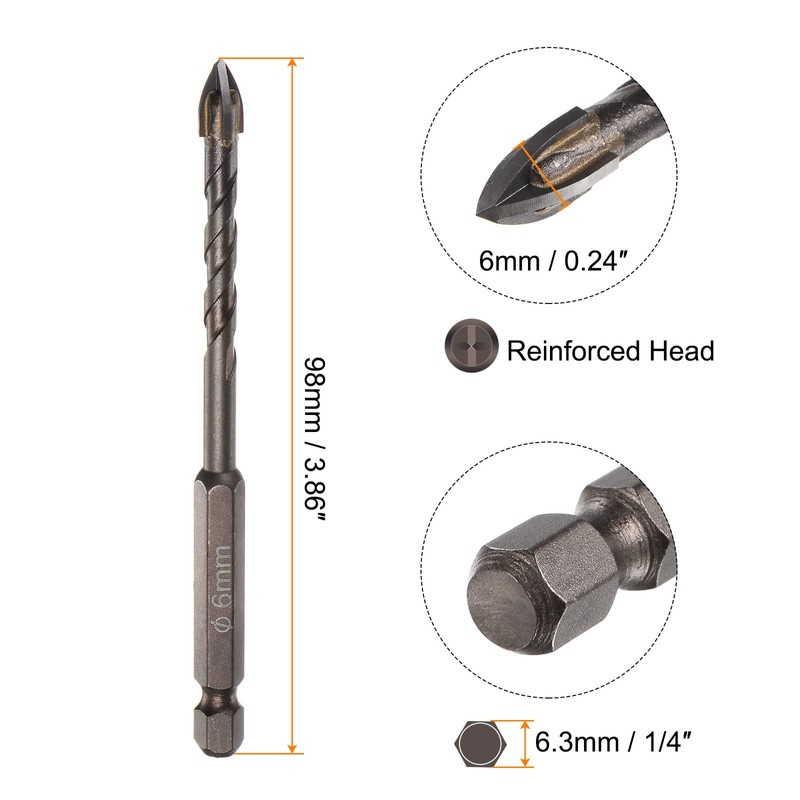 • Size - Cutting Diameter: 6mm / 0.24-inch, Shank Diameter: 6.3mm / 1/4-inch, Total Length: 98mm / 3.86-inch, 5 x masonry drill bit