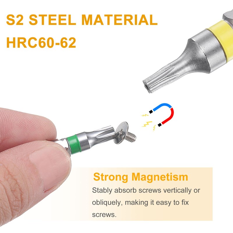 - Material - The screwdriver bits are made of specially heat-treated S2 steel with high strength and hardness (HRC60-62), durable and anti-bending, and the surface is pearl chrome for enhanced grip and corrosion resistance