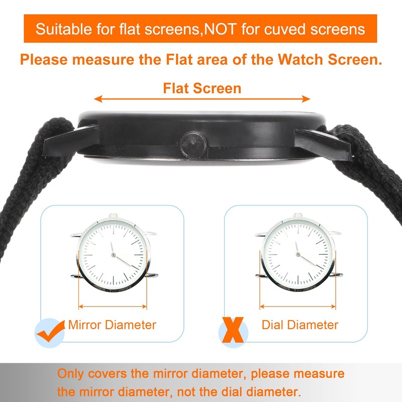 - Size - Fit glass screen size: 27mm / 1.06"; type: anti-scratch; shape: round; color: clear. Sizes vary from 15mm to 50mm. (Please measure the flat area of the watch mirror before purchasing. If there is a chamfer area, it should be excluded.)