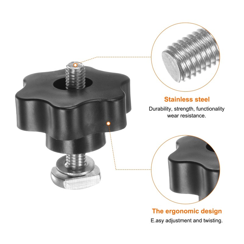 • Feature - The ergonomic design of this six-pointed star perforated knob allows for easy adjustment and twisting by simply inserting the head of the T-bolt into the track using a washer and aligning it with the threaded knob.