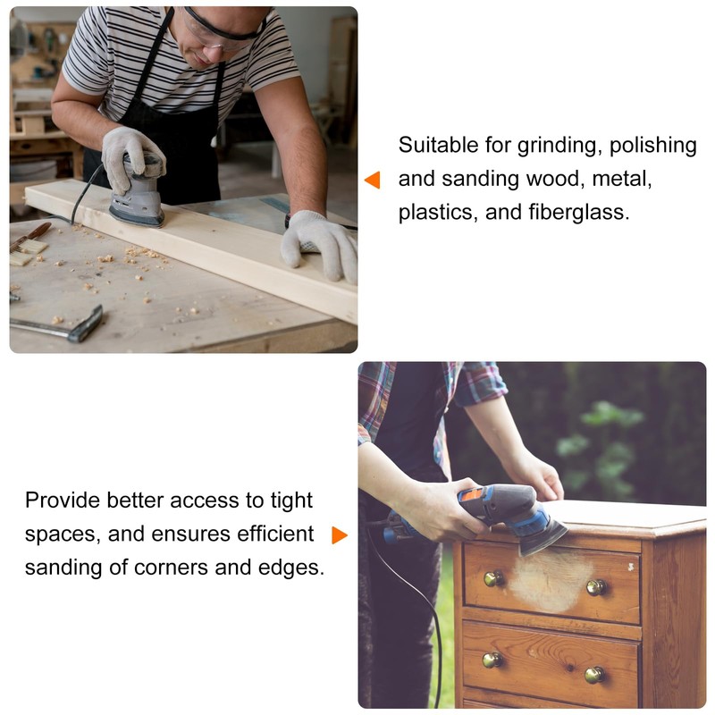 - Applications - Multitool sandpapers are suitable for wood, metal, plastics, and fiberglass. Great for general grinding, polishing and sanding in woodworking, auto repair, metalworking and general finishing surfaces. Triangular sandpapers provide better access to tight spaces and ensures efficient sanding of corners and edges.
