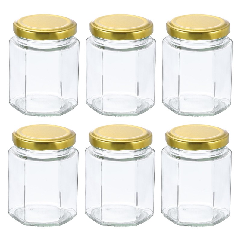 HARFINGTON 6pcs Hexagon Glass Honey Jars 6.1oz Small Mini Honey Jar Container with Gold Lids for Wedding Party Favors Bridal Shower
