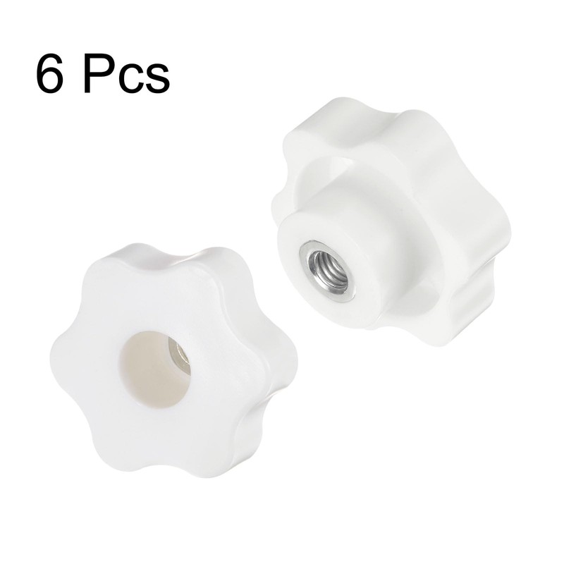 HARFINGTON 6pcs Star Knobs M8 Female Thread 48mm 6-Point Plastic Head Metal Insert Through Hole Screw-in Threaded Hand Knob Clamping Handle, White