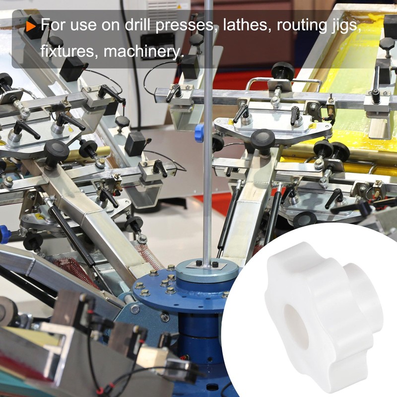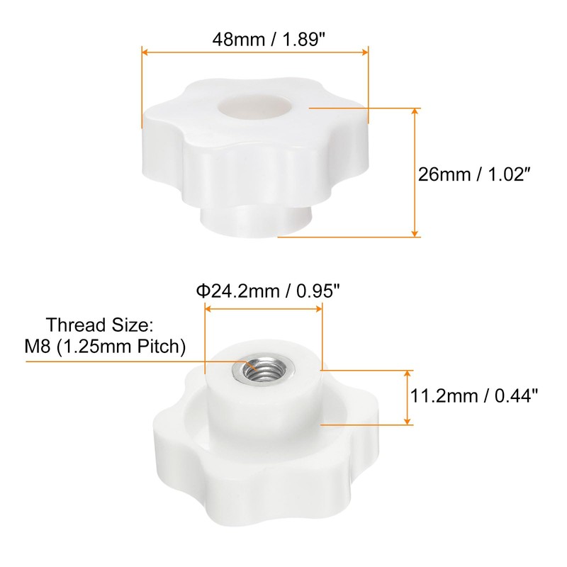 • Size - Standard thread size: M8 (1.25mm Pitch); head diameter: 48mm / 1.89"; thread depth: 7mm / 0.28"; total thickness: 26mm / 1.02"; step size: 24.2mm x 11.2mm / 0.95" x 0.44" (d*t); knob style: star knob with through hole; color: white