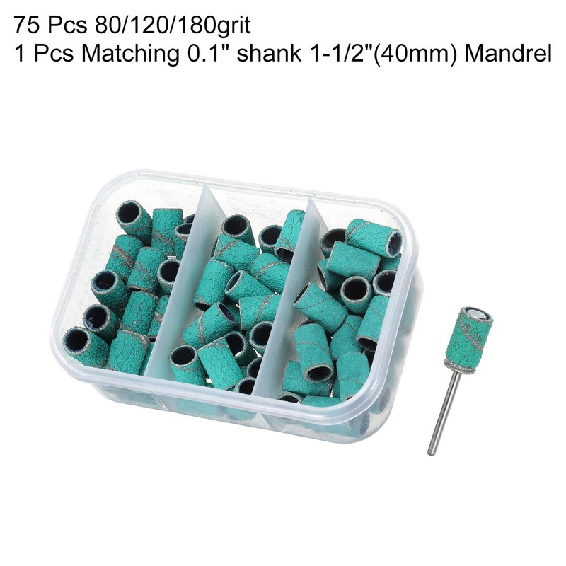 - Size - Sanding sleeve inner dia: 1/4 inch (6.35mm), height: 1/2 inch(11mm). Package contains: 75pcs 80/120/180 grit, 1pcs Matching 0.1"(2.35mm) shank 1-1/2"(40mm) Mandrel. It also comes with a small plastic storage box for convenient organization.