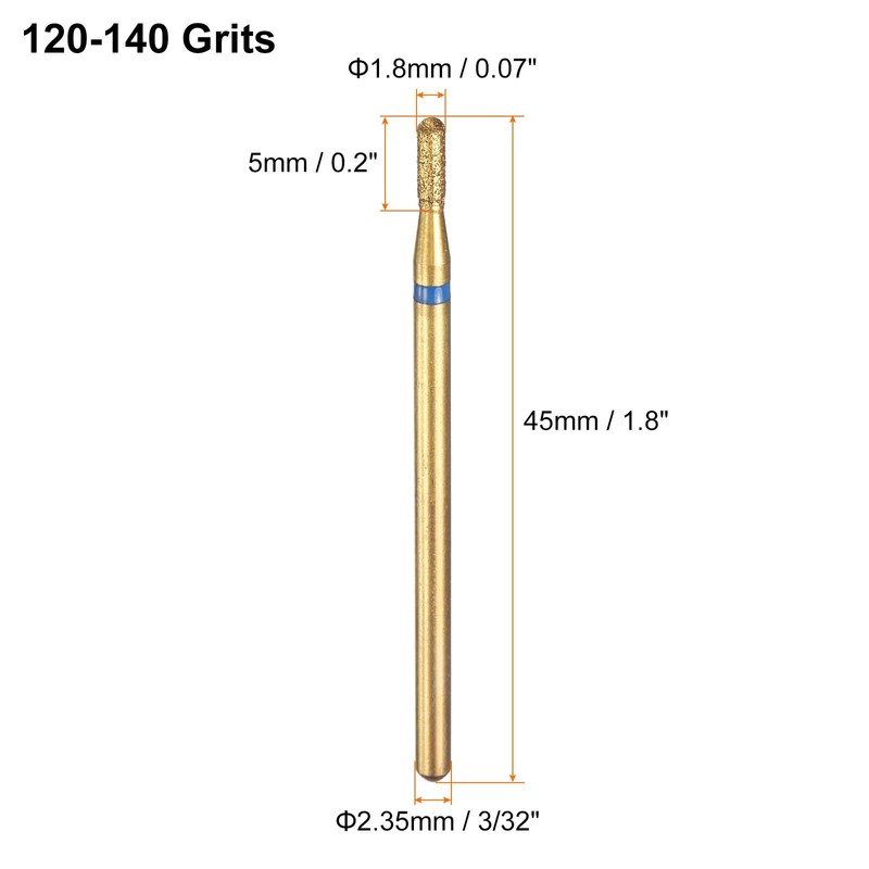 - Size - Grits: 120-140 Grits; Diameter: 1.8mm / 0.07"; Head Length: 5mm / 0.2"; Shank Diameter: 2.35mm / 3/32"; Shank Length: 40mm / 1.57"; Total Length: 45mm / 1.8"; The multi-purpose tool diamond drill bit set is packaged in a sturdy plastic box for your convenience to carry and store