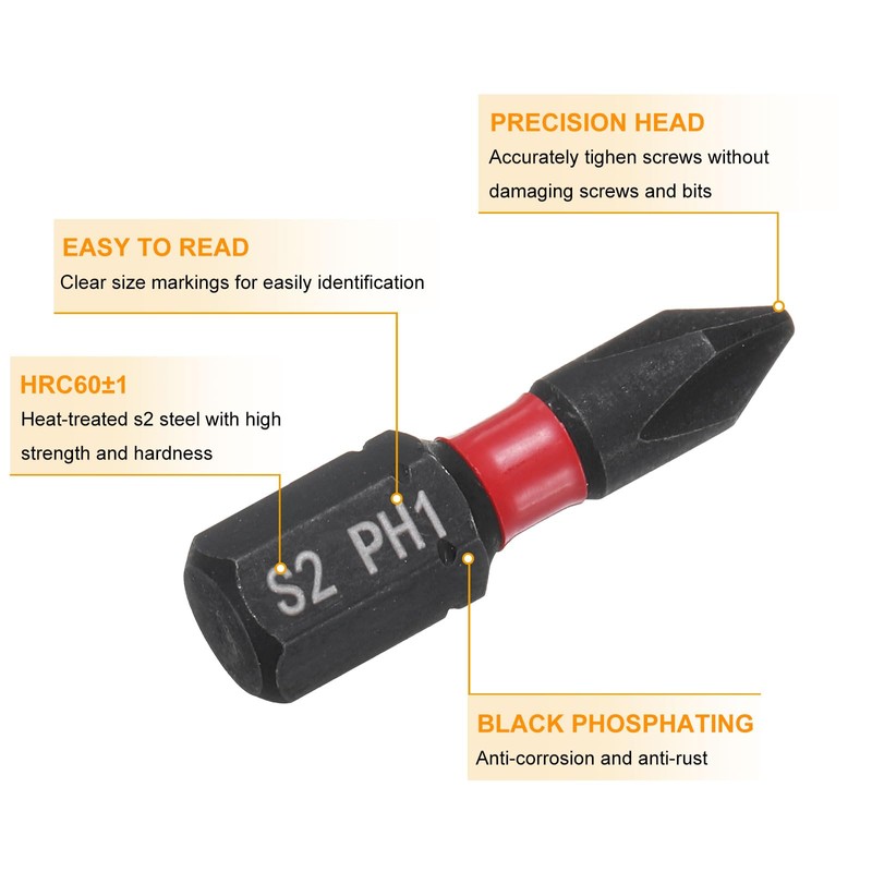 - Size - PH1; Total Length: 25mm / 1"; Shank: 6.35mm/ 1/4 inch hex shank; Phillips head drill bit specifically designed for driving screws into wood, metal, and other materials effortlessly. Can accurately tighten screws without damaging screws and screwdriver bits