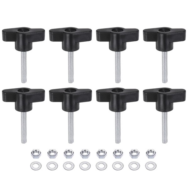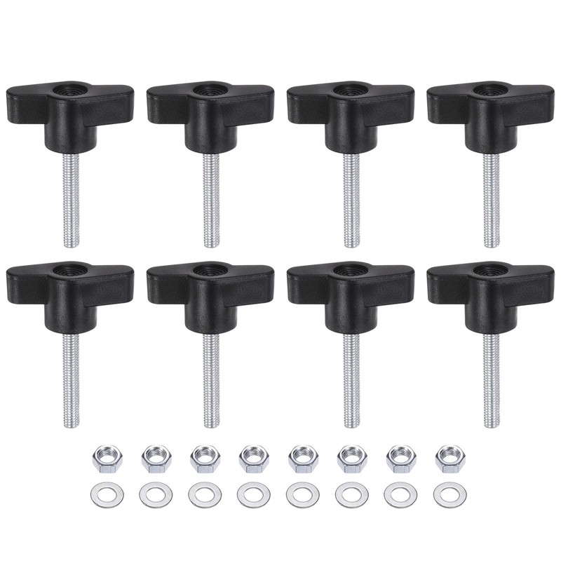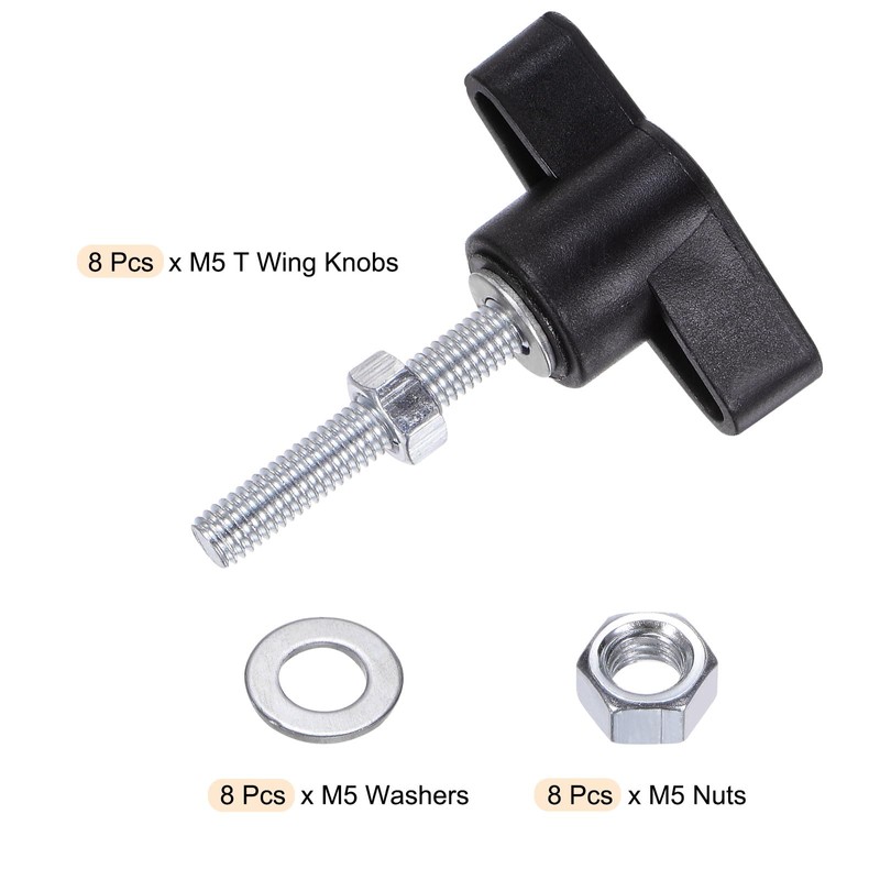- Size - Standard metric thread size: M5 (0.8mm Pitch); thread length: 30mm / 1.18"; tee wing head width: 36mm / 1.42"; total length: 48mm / 1.89"; color: black; nut and washer size: M5; knob style: Z/T knobs. Wing stud knob set with 8pcs knobs, 8pcs nuts and 8pcs washers.
