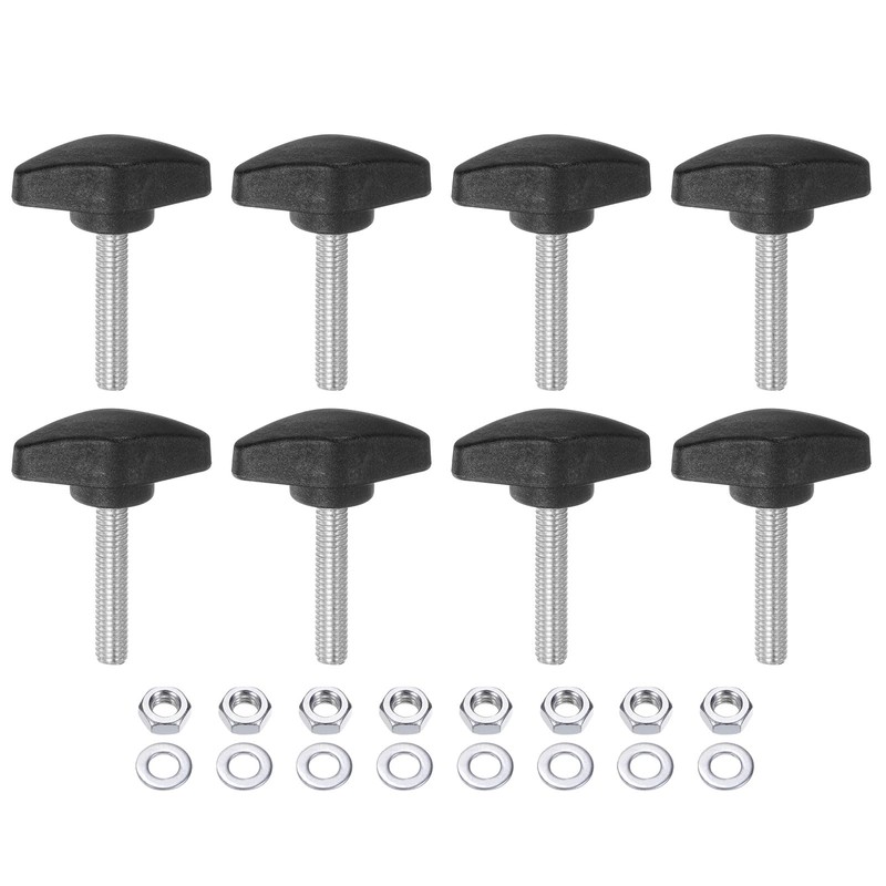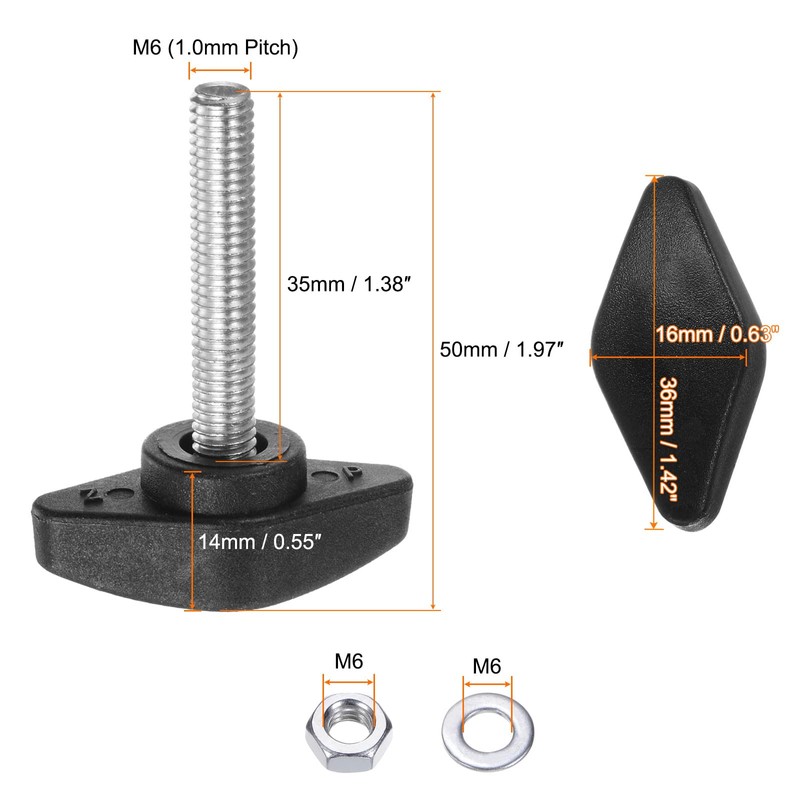 - Size - Standard metric thread size: M6 (1.0mm Pitch); thread length: 35mm / 1.38"; tee wing head width: 36mm / 1.42"; total length: 50mm / 1.97"; color: black; nut and washer size: M6; knob style: T knobs. Wing stud knob set with 8pcs knobs, 8pcs nuts and 8pcs washers.
