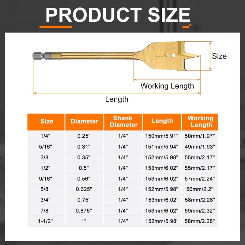 • Material - Wood spade drill bits are crafted from high carbon steel, ensuring high wear resistance and durability. The head surface is polished to enhance longevity and performance.