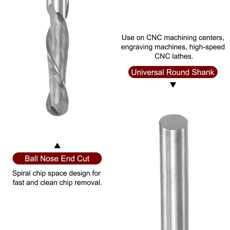 - Features - Ball nose end cut, 2-flute design. Spiral chip space design for fast and clean chip removal. Sharp cutting edge provides smooth cutting.