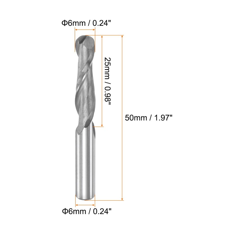- Size - Cutting diameter: 6mm / 0.24", cutting flute length: 25mm / 0.98", shank diameter: 6mm / 0.24", overall length: 50mm / 1.97", number of flutes: 2 flutes, end cut type: ball nose