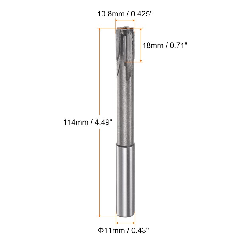 - Size - Cutting diameter: 10.8mm / 0.425"; accuracy class: H7; cutting flute length: 18mm / 0.71"; shank diameter: 11mm / 0.43"; 114mm / 4.49"; cutting direction: right hand